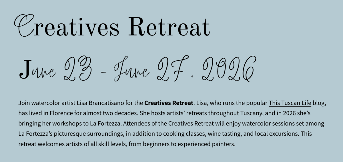 Join us for five unforgettable nights in the heart of Tuscany, where life itself becomes a masterpiece. This retreat is an invitation to slow down, savour, and see the world through an artist’s lens—whether through the stroke of a paintbrush, the flavours of a perfectly crafted meal, or the rolling hills bathed in golden light.